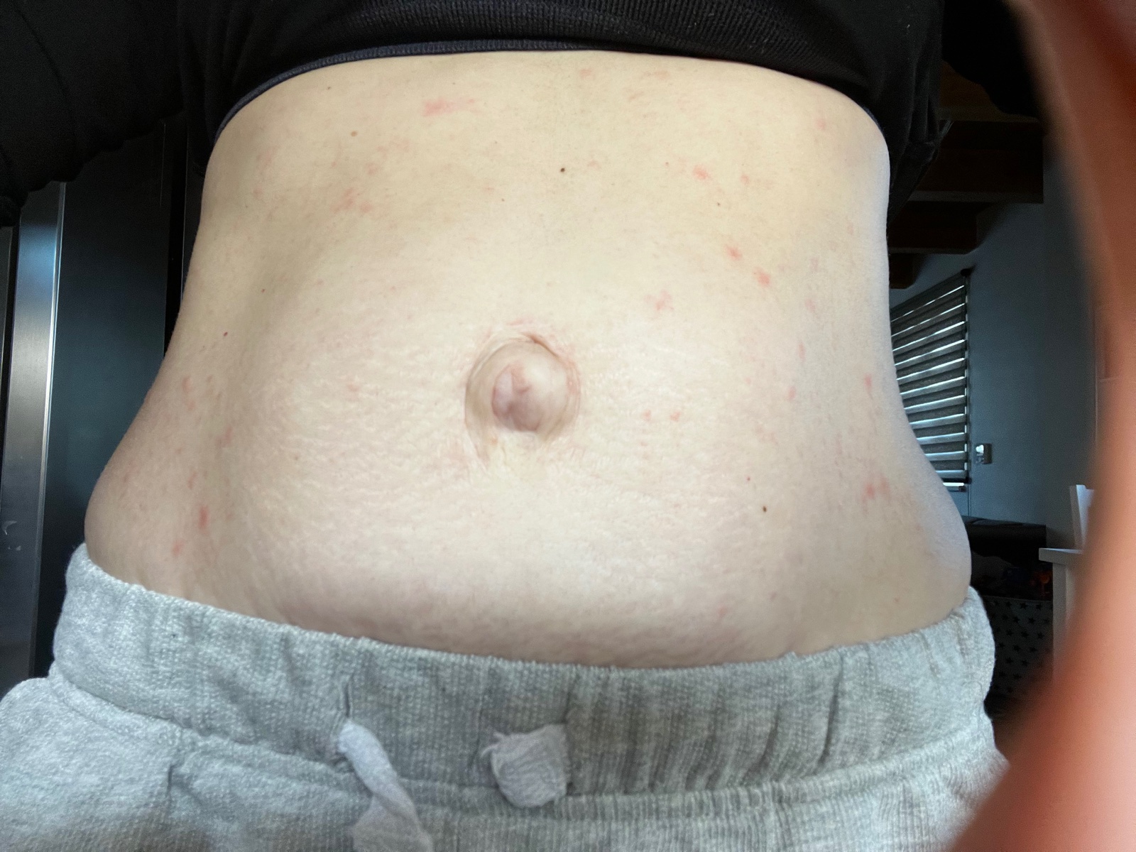 uz 3ti den mam takto vyhadzane brucho(v skutocnosti je to trochu horsie 😅). Trochu to svrbi. Od vcera si davam fenistil kvapky, no neviem ci zaberaju. Ak to do pondelku nezmizne, tak pojdem samozrejme k dr.
