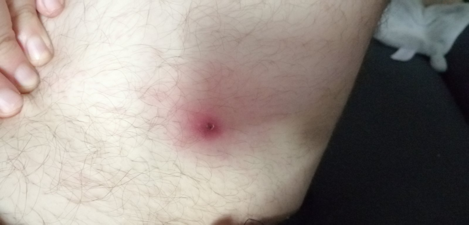Zapálené to je. Len dezinfikovat a nevytlacat, nebabrat do toho. Keby sa to zhoršilo, tak na kožné