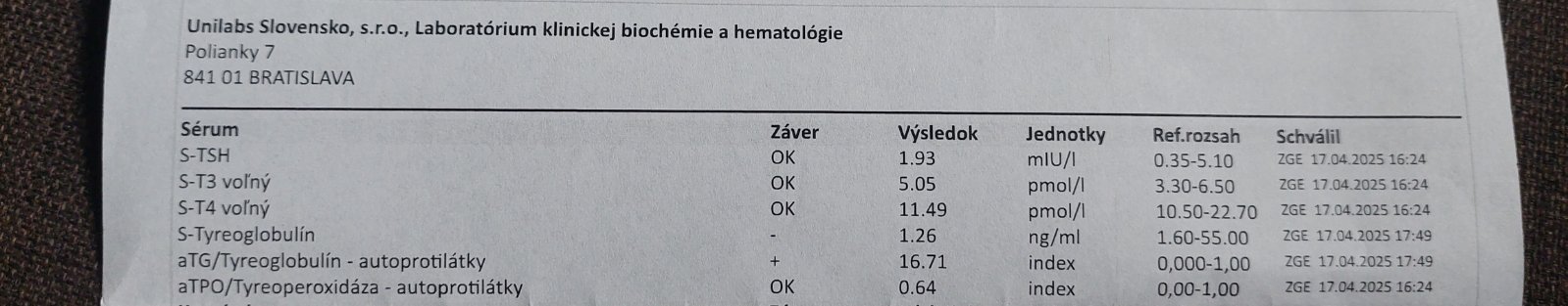 Máš zvýšené autoprotilátky aTG (to som mala pri autoimunitnej hyperfunkcii Graves-Basedow typ), ale hormóny štítnej máš v poriadku, takže tabletky si nemyslím, že by ti dali.