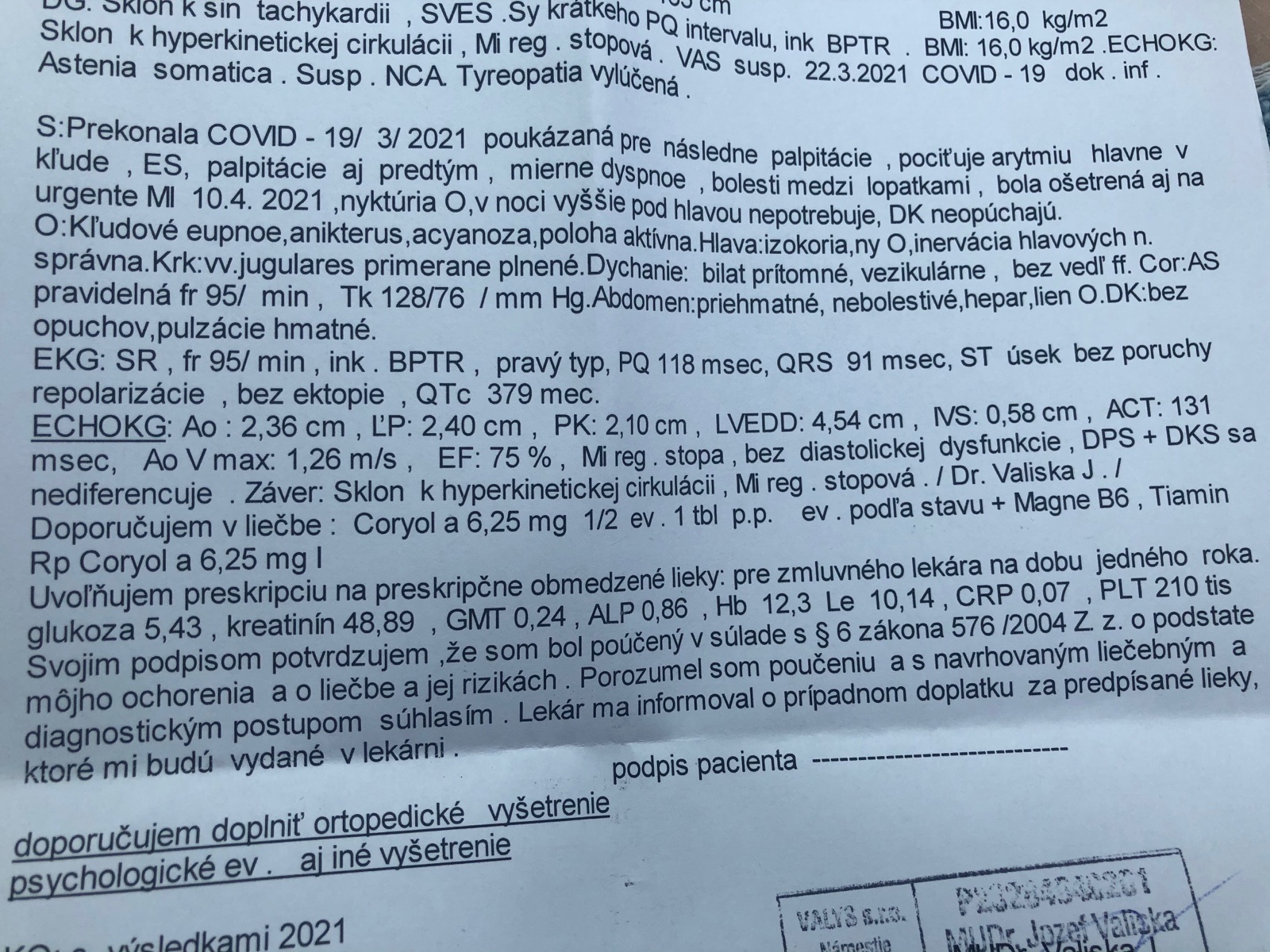 To Echo je v poriadku. Zaver ako sklon k hyperkinet cirkul. je skor na zaklade pulzu napisane. Mavaju aj postcovid pacenti aj 6-8 mes po infekcii.