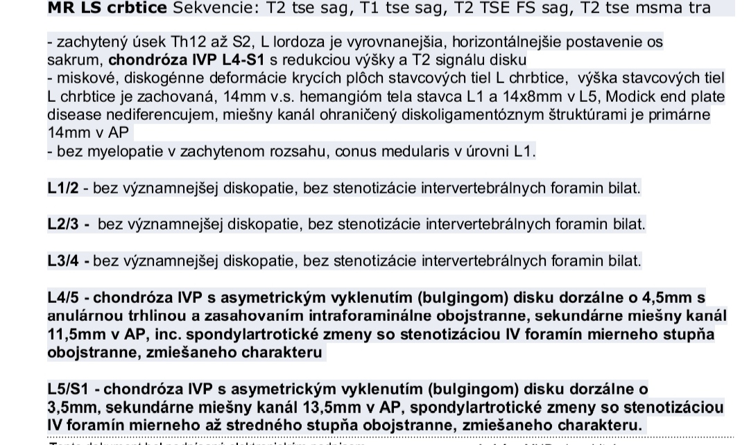 @loginexistuje celá správa je odfotená .Neurol.ma znova poslala na MR nakoľko som v bolestiach už rok a sa to zhoršuje,chcela vidieť na porovnanie .Idem k nej po novom roku tak som bola zvedavá a hlavne už chcem vedieť príčinu bolesti .Už mám za sebou všetko injekcie ,infúzie, obstreky,rehabilitácie,cvičenie a neviem čo všetko. Rok som doma a je mi horšie ako pred rokom.