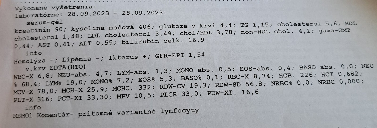 Priložím foto výsledkov. Tiež tam má napísané PRÍTOMNÉ VARIANTNÉ LYMFOCYTY, vedel by mi niekto vysvetliť čo to znamená?