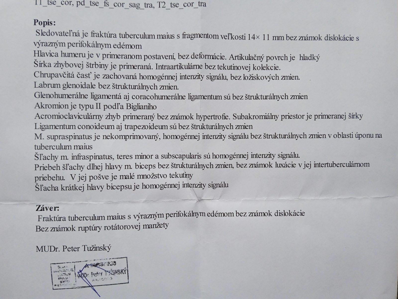 @frzeiovn máte tam napísané že veľký kostný výbežok ramennej kosti je zlomený, a nie je zjavne posunutý. A je to tam tam opuchnuté, nie je tam kolekcia vody.. ani v kĺbe..nemajú tam, čo vyťahovať.. šľachy nie sú potrhané.. toť zjednodušený preklad..ale teda chirurgické postupy nepoznám.. ideál nájsť zastupujúceho chirurga či traumatologa.. alebo sa potom ešte poradiť s obvodakom, za kým máte ísť ak nemáte zástup.. otázka ešte ako dlho to máte..ak dlho tak už asi sa aj tak hojí..a ak nezoženiete chirurga, či traumatologa, tak minimálne šetriť ruku..ale tipujem že tam niet čo operovať, predpokladám že fixácia..