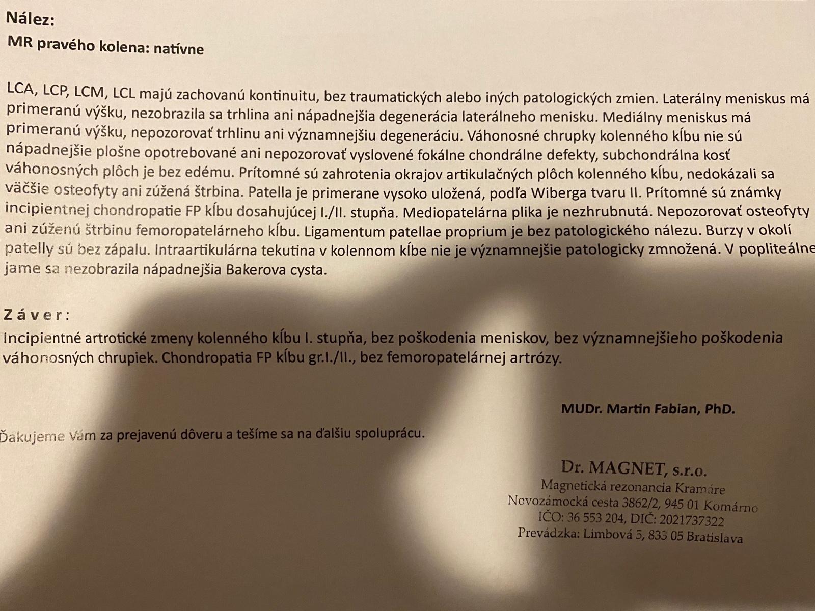 začínajúca artróza a chondropatia. Ide o postihnutie kolennej chrupavky, o jej mäknutie a postupné zmenšovanie, proces sprevádzaný intenzívnou bolesťou. Ostatné veci sú podľa nálezu v norme