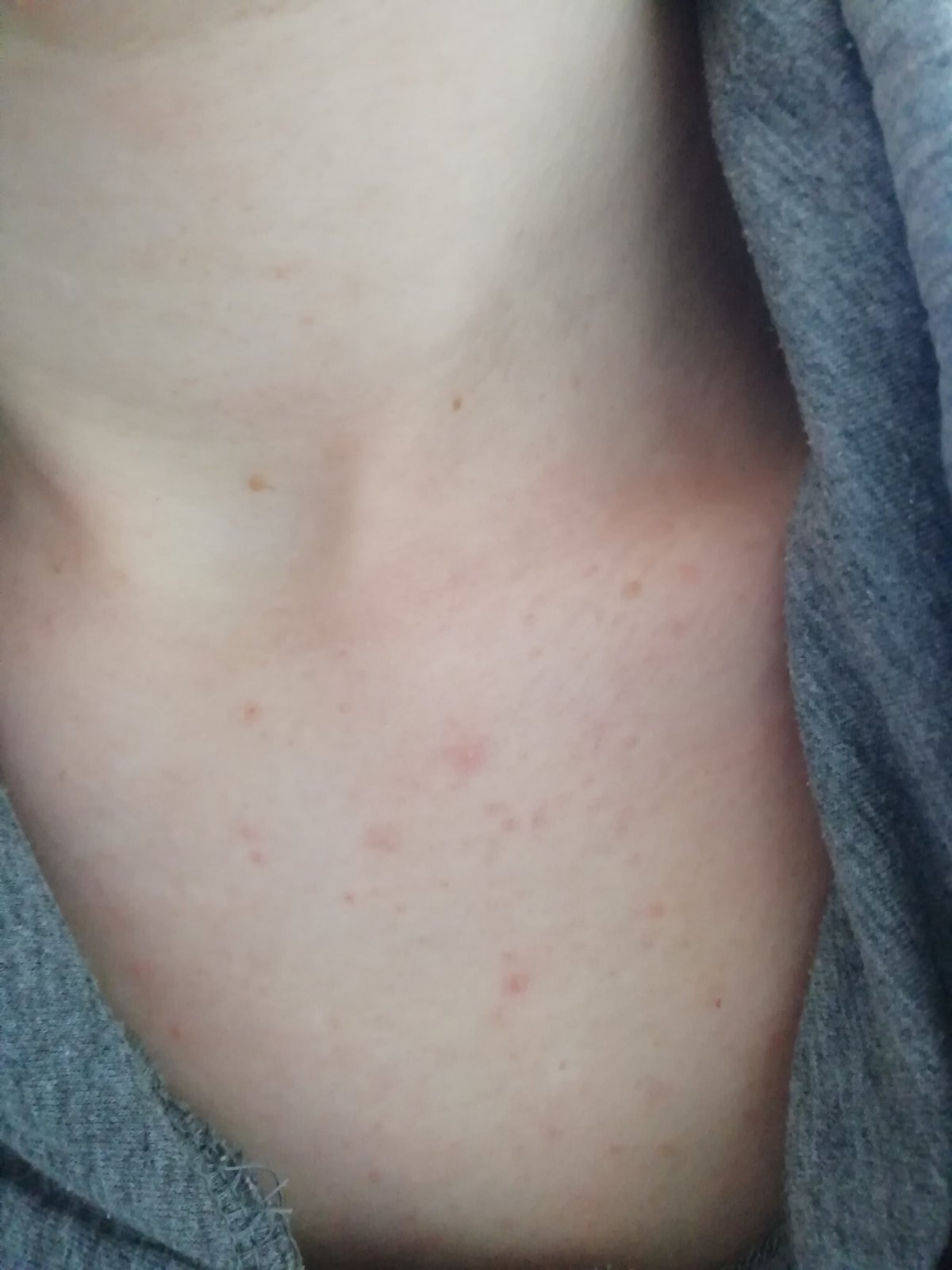ahoj. pozri moju skupinu https://www.modrykonik.sk/group/11789/ . je tam uvedeny aj specialny sprchovaci gel s bylinkami, mohol by ti pomôct to vyčistiť a zahojiť. vyzerá to len akoby z podráždenia alebo nemáte v práci moc teplo, ak más nejakú uniformu.