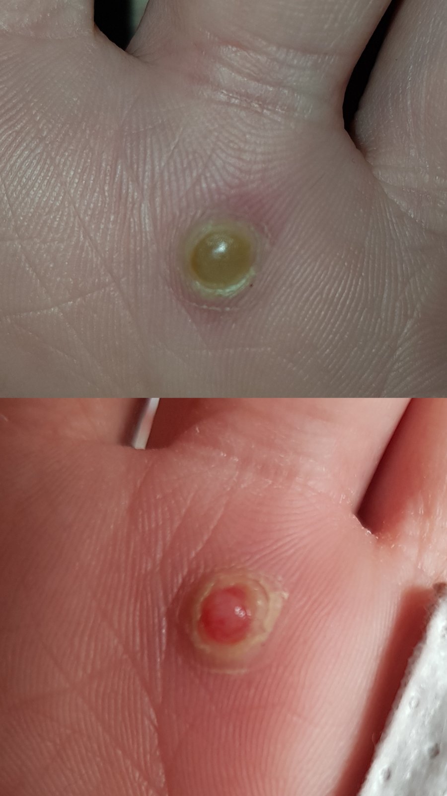 Ahojte ženy, prepáčte za nechutnú foto. Mam roky bradavicu na dlani, veľkosť ako sosovica ale hlboka a vypukla dost no a rozhodla som sa ju odstranit pomocou duofilmu. Uz som raz o to pokusala ale nedokoncila to, vtedy sa mi pekne prva vrstva hruba dala odstranit no a potom som skoncila. Asi 2 tyzdne som si teraz natierala, prvá vrstva povolila ,nebola moc hrubá, nic nasilu, nic do živého. Pokracovala som ale zacalo sa mi to zapalovat. Dnes som si z nej vytlacila plno hnisu ,stale je dost vypukla a hlavne teraz mi to mokvá, mam to prelepene a nosim rukavicu ked treba pri niektorych ukonoch.