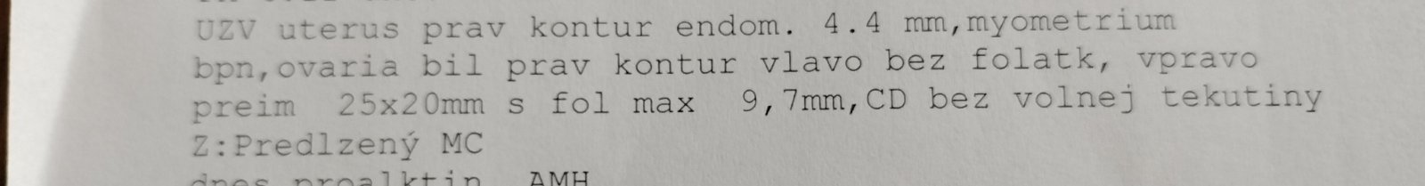 @cca123 • Maternica a výstelka (endometrium) sú normálne. • Oba vaječníky majú normálny tvar. Na ľavom vaječníku nie sú viditeľné folikuly, ale na pravom vaječníku je dominantný folikul, čo naznačuje blížiacu sa ovuláciu. • Nebola zistená žiadna voľná tekutina v panve. • Menštruačný cyklus je predĺžený, čo môže byť spojené s hormonálnymi zmenami.