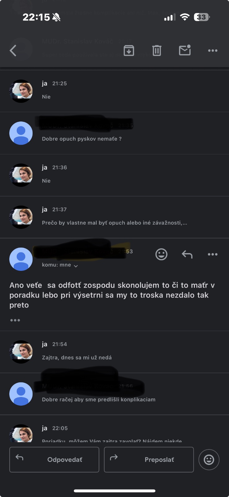 Mňa by ale zaujímalo, ako je možné, že tá osoba vie, že si dnes bola na vyšetrení.....