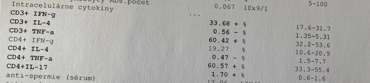 Ahojte, chcela by som sa spytat, ake su prosim vase hodnoty zvysenych/znizenych cytokinov a ci vam pri tych hodnotach nasadili kortikoidy alebo povedali ze kortikoidy nie su potrebne? Ja mam niektore hodnoty zvysene a na reprodukcnej imunologii v NR mi povedali ze nie je potrebna liecba a na reprodukcnej imunologii v Ba mi povedali ze nasadit kortikoidy. Moje hodnoty su na foto.