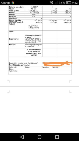 @wildstorm ahoj, chcem sa spýtať, manžel bol na spermiograme a papierové výsledky: oligoteratozoospermia, patologia: 99, motolita:55, množstvo 13 milionov, ostatné si už nepamätám, ale lekárka povedala, že s týmito výsledkami nevidí problém, že možno ich bolo menej ako 15 miliónov, ale že to možno zo stresu, kedže tam bol po prvýkrát a že nie všetky mali ideálny tvar, ale že inak všetko ok.....ale ja neviem, nerozumiem sa tomu