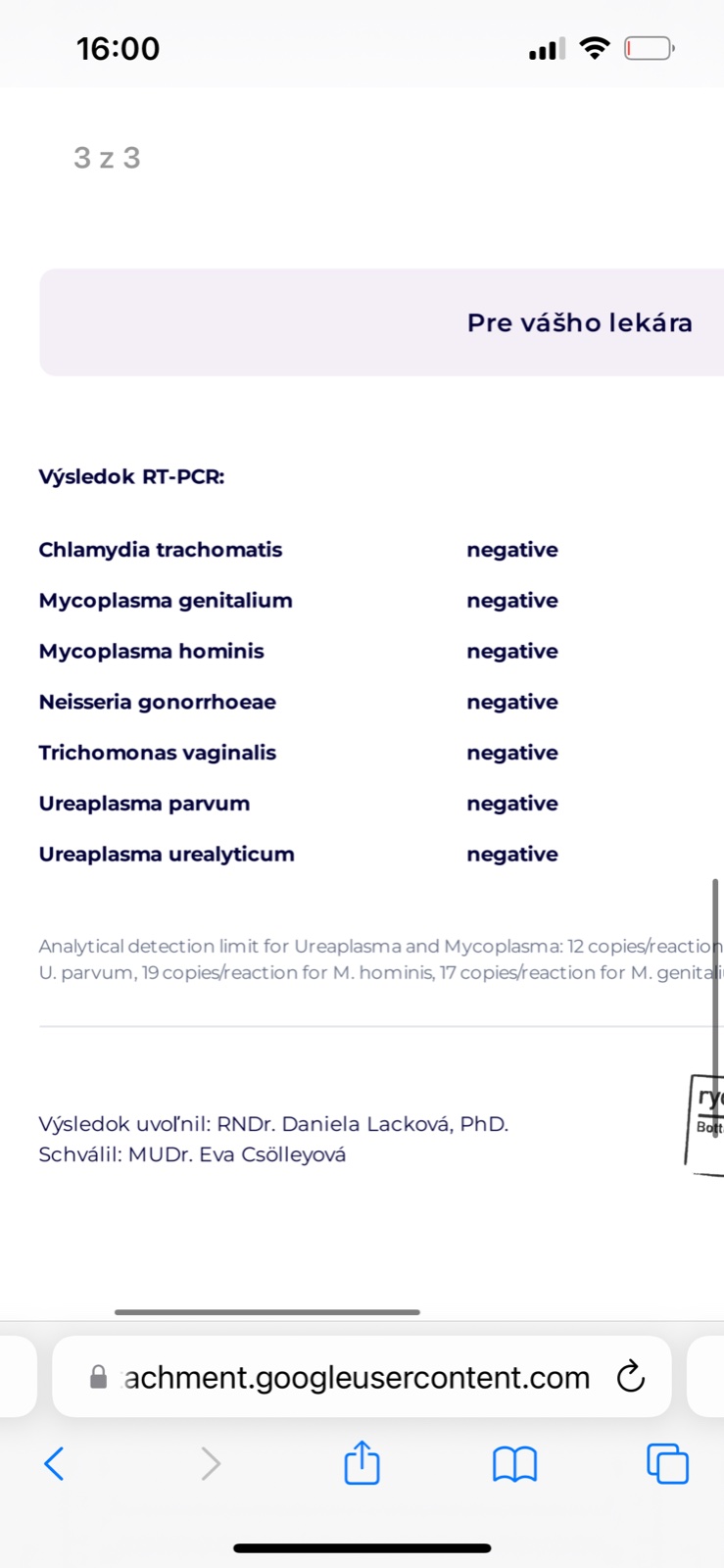 Ahojte, dala som si spravut testy na sexualne prenosne ochorenia z mocu. Vsetky vysledky mam negativne. Dlhodobo mam pocut svrbenia a zapalu v posve, mam pocit ze mi macmiror ani polygynax nezabera a preto som na tieto testy sla. Som prekvapena ze vysli negativne- nie ze by som bola nejaka radodajka ale dufala som, ze dostanem atb preliecim a budem mat pokoj- nie ze budem na tom istom. Ze stale pocit svebenia/palenia a neviem z coho. Chcem sa spytat ak je tu nejaka lekarka, je mozne ze vysli negativne preto lebo boli robene z mocu? Bol to test rt-pcr. Prikladam aj fotku.