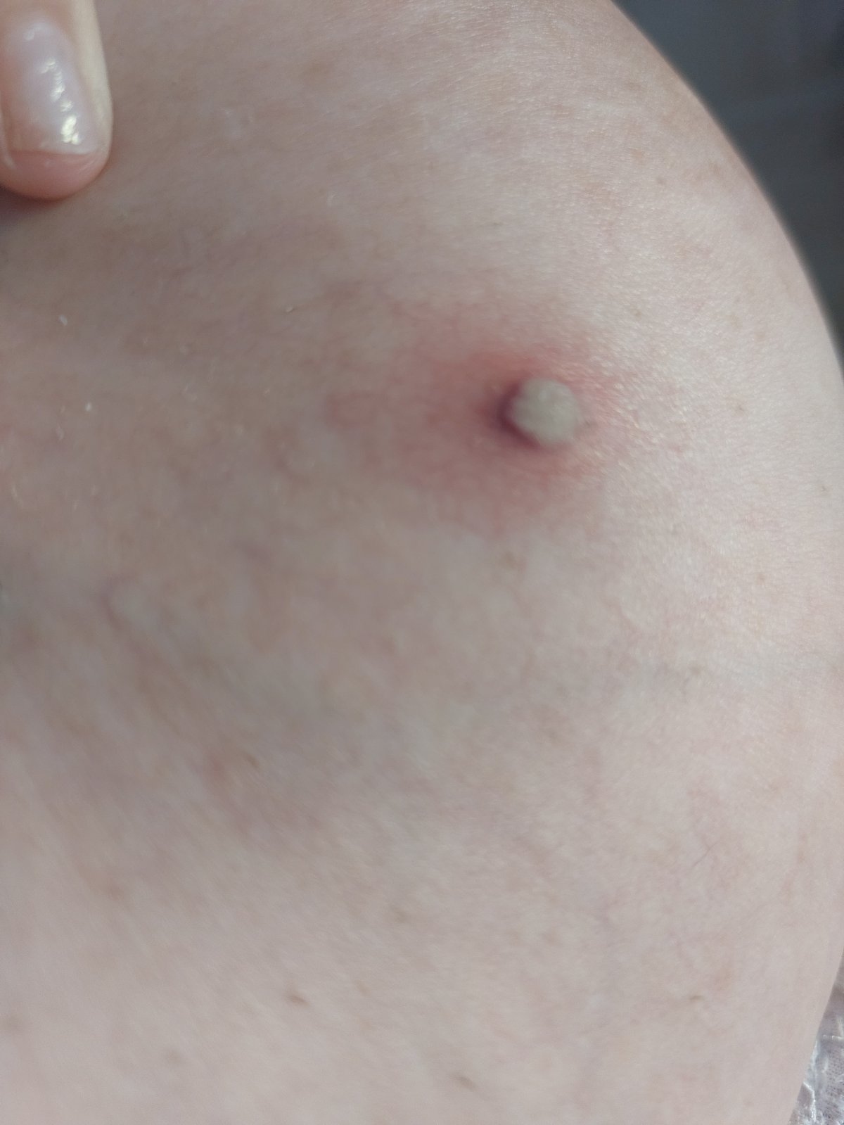 To je hnisavá to je od podprsenky otlačene. Praskne sama nevytláčaj a bude dobre. Poridné s niečim namastiť.