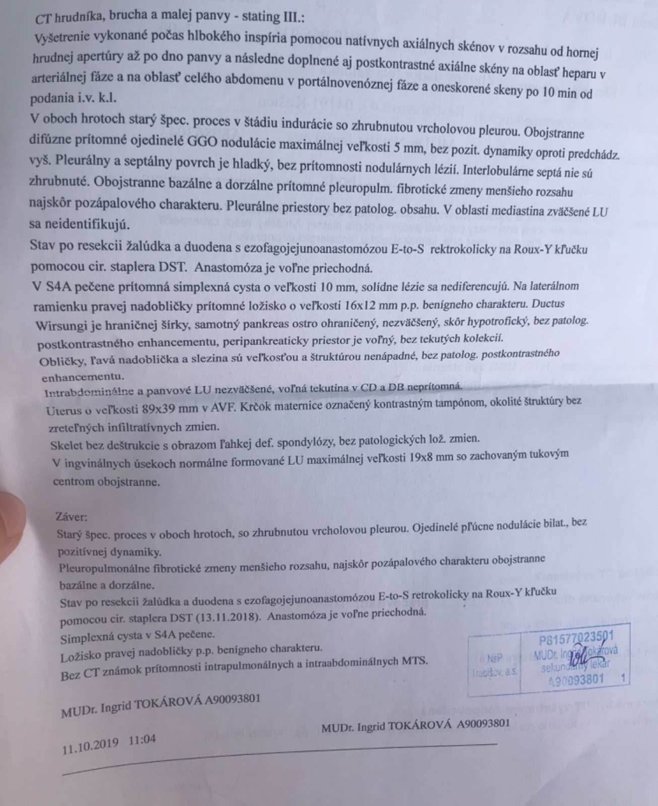Bez znamok metastaz 🙂 neviem, co k tomu by ste chceli este, nevyzera to zle, je to zoperovane v poriadku, metastazy sa nenasli