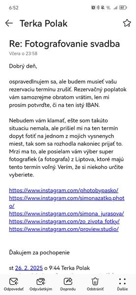 Následne sa fotografka odvolávala na neexistujúcu platnú zmluvu, pretože sme nepodpísali písomnú dohodu. To nás ešte viac prekvapilo, keďže sme uhradili rezervačný poplatok a vo všetkých komunikáciách bolo jasne dohodnuté, že 6. 6. 2026 je náš termín.