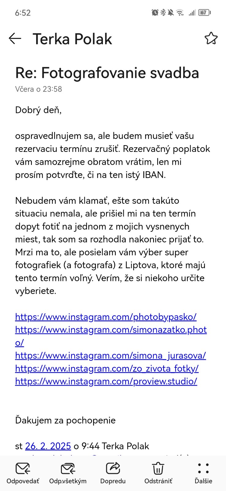 Následne sa fotografka odvolávala na neexistujúcu platnú zmluvu, pretože sme nepodpísali písomnú dohodu. To nás ešte viac prekvapilo, keďže sme uhradili rezervačný poplatok a vo všetkých komunikáciách bolo jasne dohodnuté, že 6. 6. 2026 je náš termín.