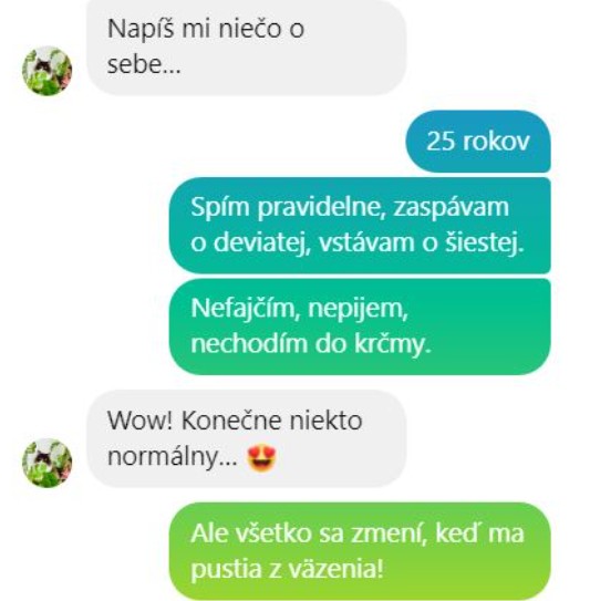 Ak mu napíšem moje číslo, tak si ma nájde hneď online. Vyjde mu minimálne 7 odkazov na mňa, kde nájde moje meno, meno mojej firmy a všetky informácie a to nechcem. Ešte by bolo riešenie si zriadiť jedno číslo, ale ja cez deň nebudem nosiť kvôli tomu dva telefóny, čiže číslo by bolo aktívne po 20.00 hodine jedine. Ale príde mi to zbytočné. Ak si sadneme ľudsky a budem vidieť, že to má zmysel, že sme na rovnakej vlne a sympatickí jeden druhému, tak mu nemám problém to číslo dať. Ale to nie je po jednej správe a jednom dni. Veľa ľudí z môjho okolia nevie, že som single. Vedia to rodičia, moje sestry a dve kamošky. Všetci ostatní si myslia, že žijem v usporiadanom vzťahu s mojím ex. Ja nerozoberám moje vzťahy na verejnosti a rovnako on. A nechcem chodiť na žiadne speed date meetingy, to sa nehodí. S mojím ex sme sa zoznámili na konferencii, kde on prednášal, tak stále dúfam, že niekde tam stretnem ešte v budúcnosti toho pravého.