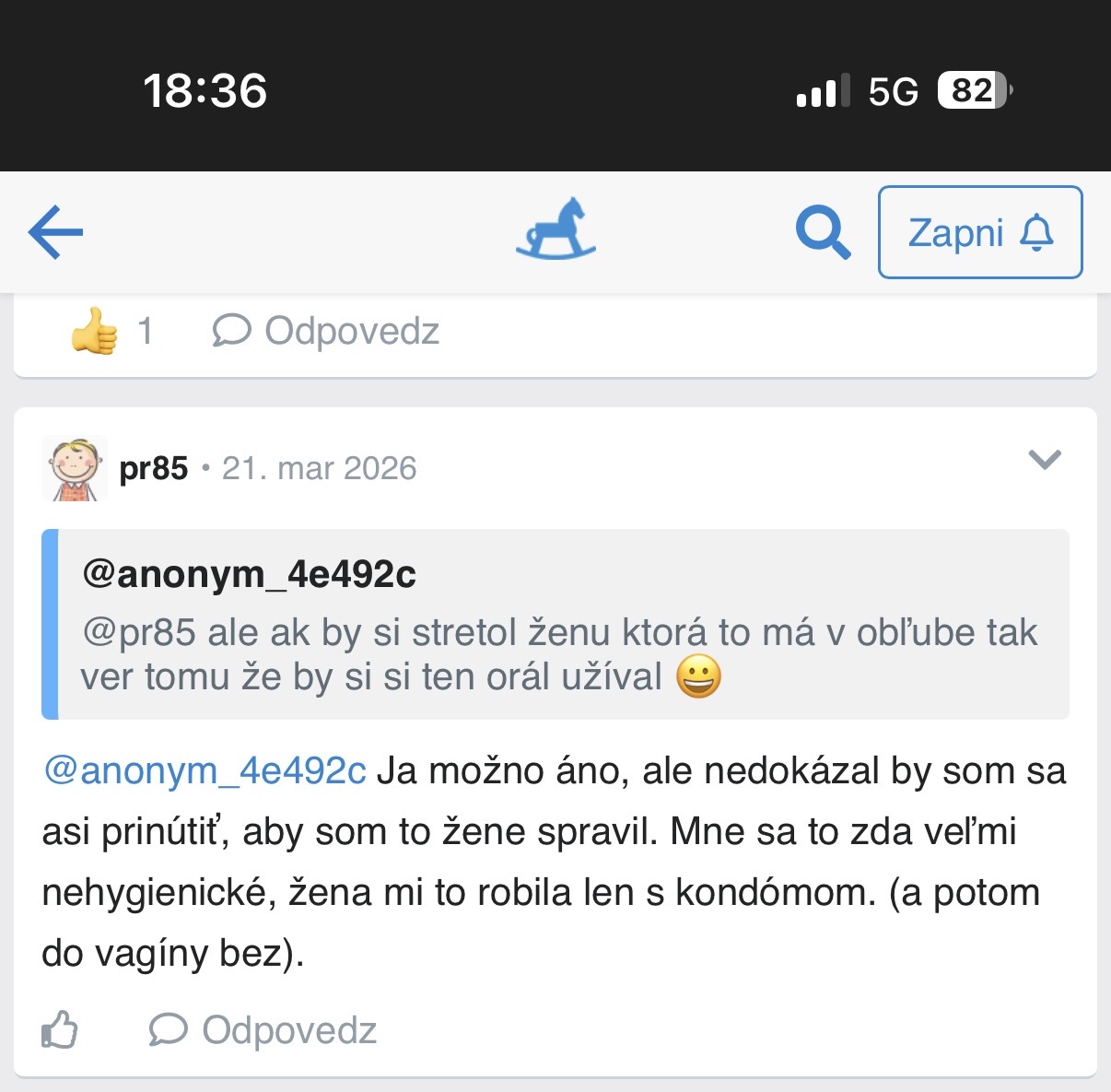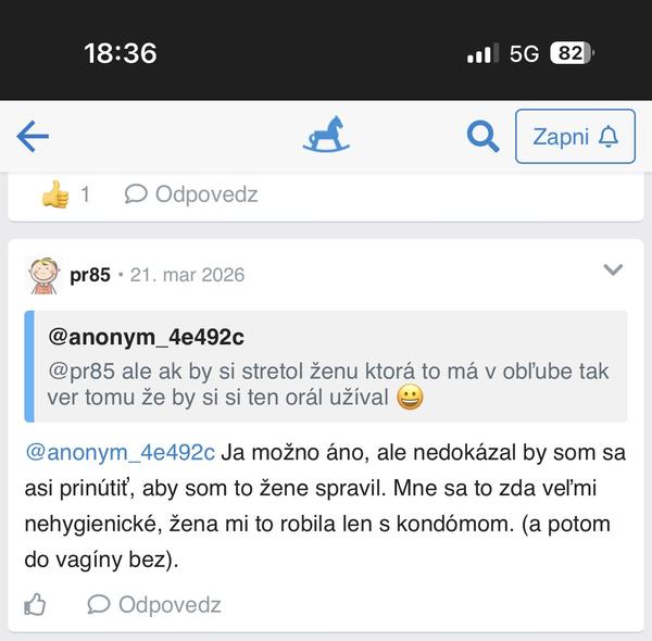 @anonym_fe74e0 To raz v téme o orále písal, že kedysi to so ženou skúšali, ale s kondómom,lebo sa jej to hnusilo a ani to už nepraktizujú a ani on jej to preto nerobí. Že im to nevyhovuje.Pôsobí dosť neukojene chudák.