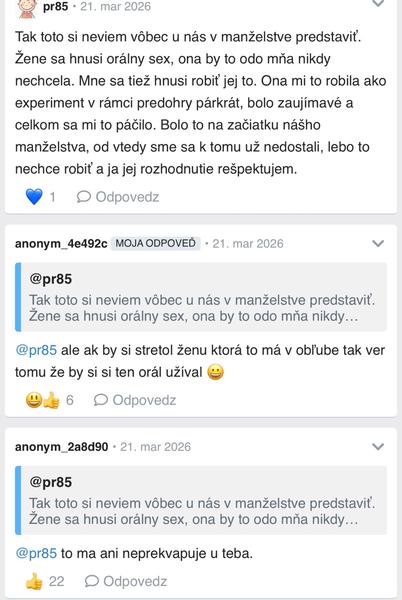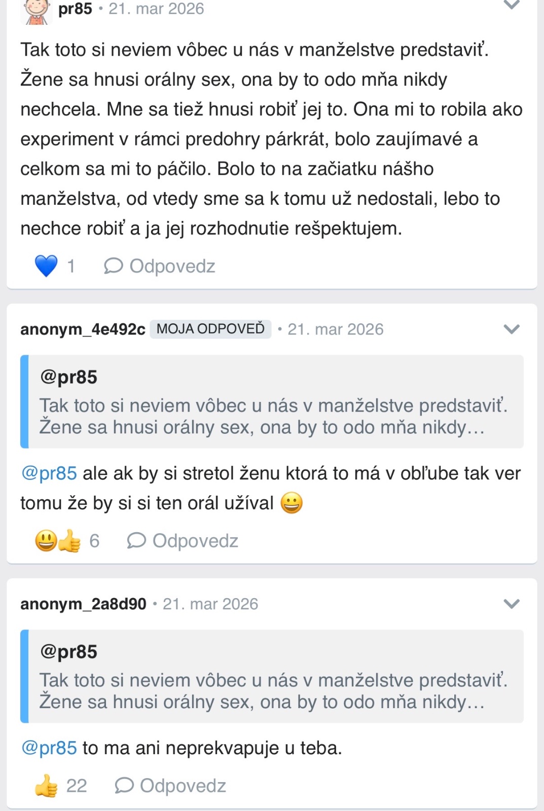 Ja sa ani nečudujem že jeho žena nechce robiť oral. Prečo by mala robiť orál ak mužovi sa hnusi vagína ? Potom naj sa nesťažuje že ten orál nemá.