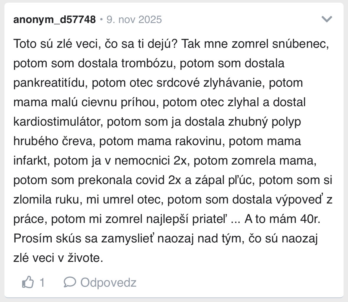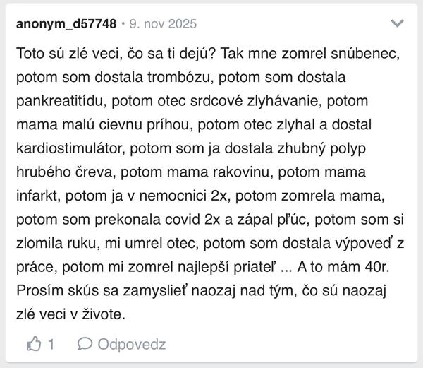 @anonym_autor Jasne ze to nie si ty 🤡, ani si neprisla pri nehode o snubenca, o dieta, rodicov, najlepsieho priatela, mas zdravotny handicap, nikam nechces /nemozes chodit - v kazdej teme trochu pozmenene skutocnosti - ale tvoj arogantny prejav sa zakryt neda, moja. Uz si dostala svoju davku pozornosti, tak dobru noc, vidime sa opat nabuduce, ked sa ti zaziada pozornosti..