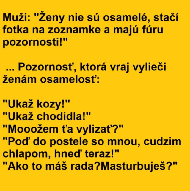 @anonym_383e0a ibaže mňa muži nezaujímajú. Píšem tam o tom hnuse, ktorý na zoznamkách zostal, alebo sa tam postupne dostáva. Veď sama vidíš tú žensku, čo sem pridáva prefotené obrazovky, čo je to za mozog si fotiť obrazovky? Na zoznamkách jednoducho vzniká určitá "ženská stoka", kde končia tie, o ktoré už nikto nemá záujem.