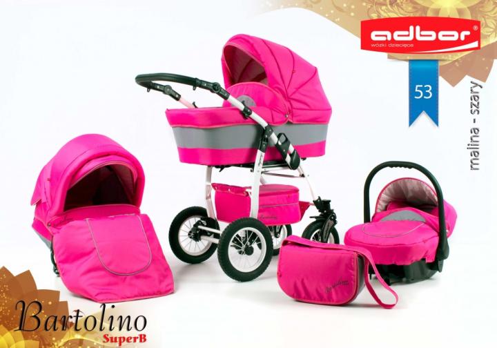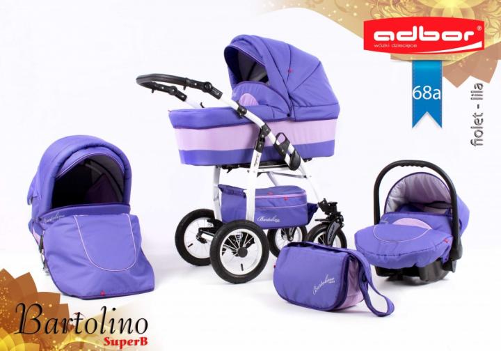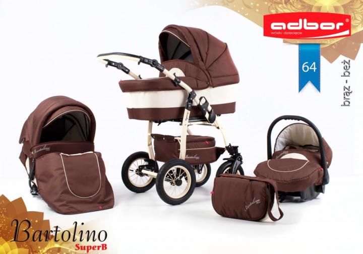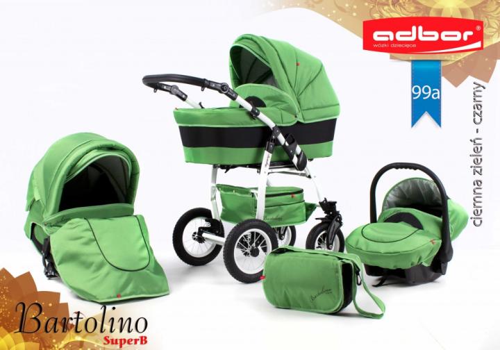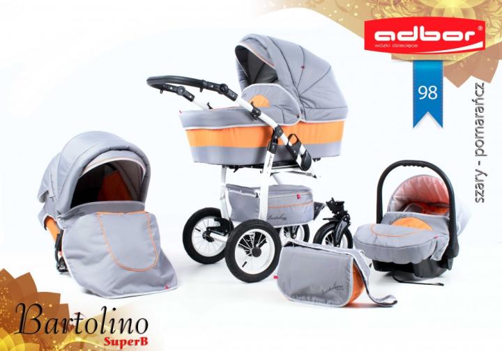 Adbor Bartolino SuperB je robustný kombinovaný kočík s nadstavbami rovnakými ako klasický Bartolino Classic, avšak s konštrukciou s prednými menšími, otočnými kolesami. Určený je najmä pre menej náročných rodičov, ktorých okrem ceny poteší množstvom výrazných farieb na výber, plne odpruženou konštrukciou s nafukovacími kolesami a priestrannou vaničkou s polohovaním. Všetky nadstavby môžeš na konštrukciu nasadiť v oboch smeroch. Športové sedadlo môžeš polohovať až do ľahu, a to vrátane opierky nôh. Voliteľne si ku kočíku možno dokúpiť autosedačku Berber Carlo, prípadne niektorú zo známejších značiek autosedačiek s koncovkou Maxi-Cosi s príslušnými adaptérmi. Ku kočíku získaš aj výbavu: pláštenku, moskytiéru, nánožníky a prebaľovaciu tašku.