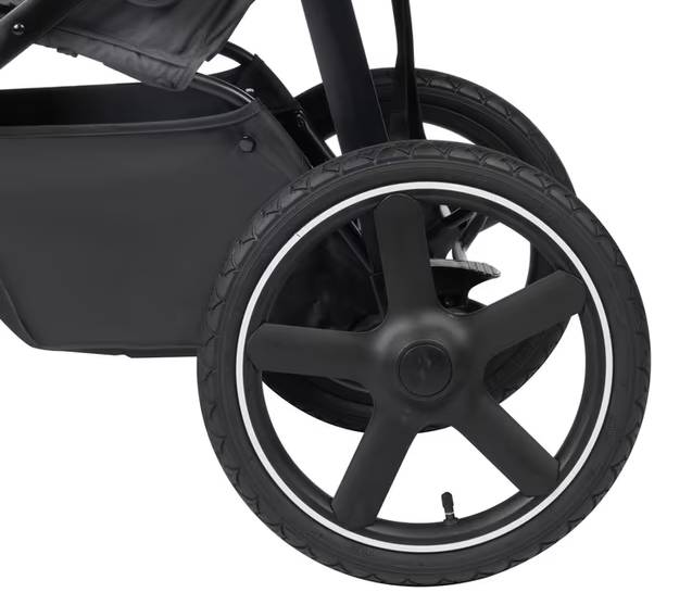 nafukovacie kolesá (otočné s možnosťou fixácie) • vhodný pre vysokých rodičov • takmer úplný rovný ľah (165°) • priestranné sedadlo • veľký úložný priestor • brzda na rukoväti • skladanie jednou rukou • skladacia vanička • možnosť pripojenia autosedačky • zadné kolesá ⌀40 cm • hmotnosť kočíka 16 kg • nosnosť sedačky 22 kg • šírka kočíka 79 cm