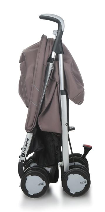 Casualplay Dadá je moderný golfový kočík špecifický úspornejším teleskopickým skladaním, vďaka ktorému po zložení samostatne stojí či môže byť ťahaný za sebou ako batožina. Konštrukcia je vyrobená z pevného eloxovaného hliníka. Menšie zdvojené kolieska sú určené na menej náročné prechádzky mestom, pre hladšiu jazdu sú individuálne odpružené. Sedadlo je veľmi priestranné a vhodné aj pre väčšie, staršie deti. Môžeš ho polohovať, ale len do čiastočného náklonu. Je preto vhodné pre deti, ktoré už samostatne sedia. Okrem polohovania chrbtovej opierky sa dá zdvihnúť aj opierka nôh. Dadá je štandardne dodávaný s pláštenkou, ktorá sa nazipsuje na robustnú striešku.