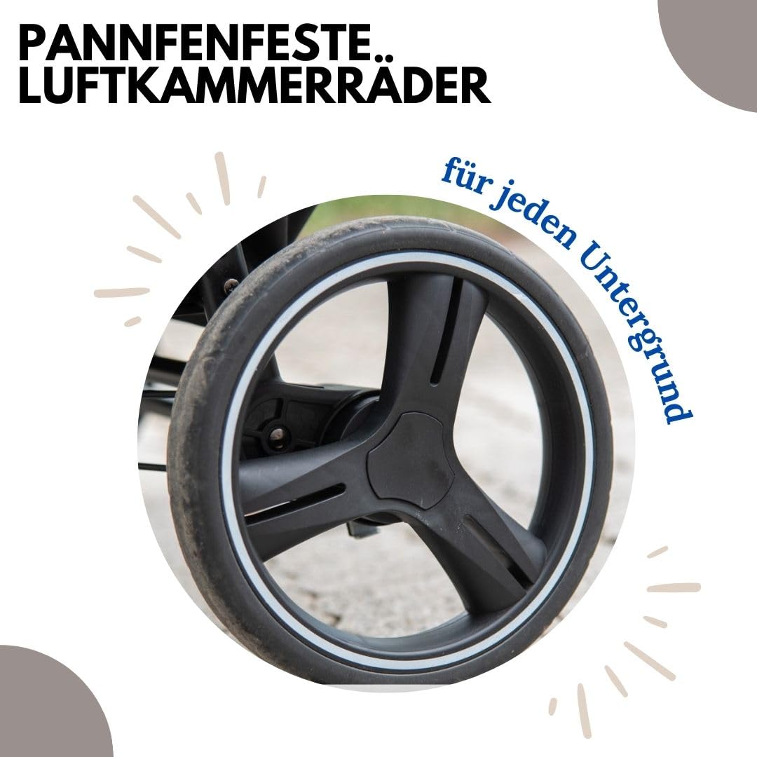 nafukovacie kolesá (otočné s možnosťou fixácie) • takmer úplný rovný ľah (165°) • Chrbtová opierka ide polohovať do kolmého sedu (90°) • priestranné sedadlo • velmi skladný • veľký úložný priestor • skladanie jednou rukou • možnosť pripojenia autosedačky • zadné kolesá ⌀24 cm • hmotnosť kočíka 11.4 kg • nosnosť sedačky 22 kg • šírka kočíka 55.5 cm