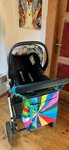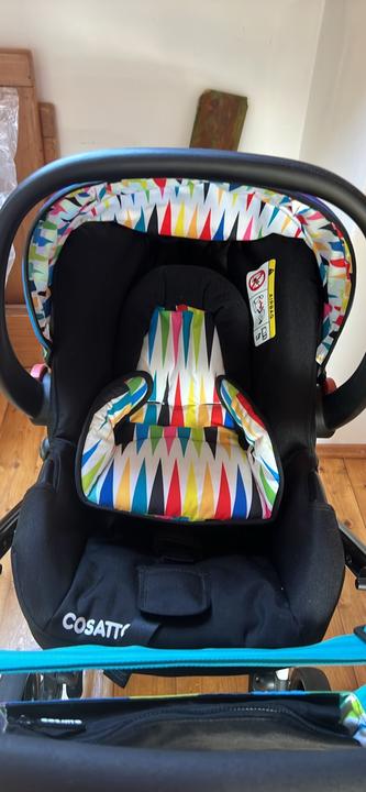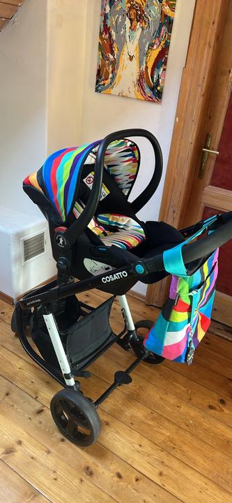 Krásny farebný kočík, s ktorým budete na ulici nepriehľadnuteľná. Výhoda trojkombinácie. Autosedačka sa dá upevniť na konštrukciu kočíka. Hlboká vanička krásne obložená.