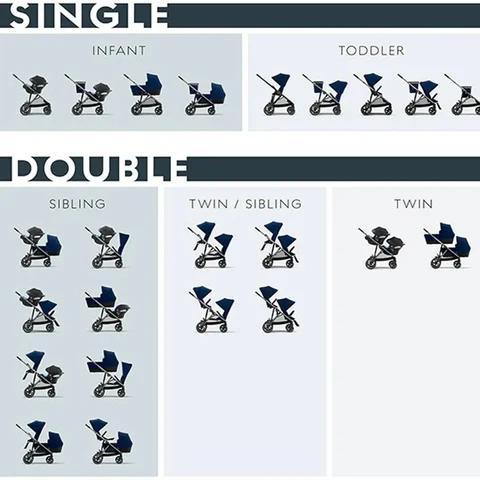 - možnosť rozšírenia na súrodenecký kočík s využitím viacerých kombinácií sedadiel, vaničiek a autosedačiek v 23 konfiguráciách,