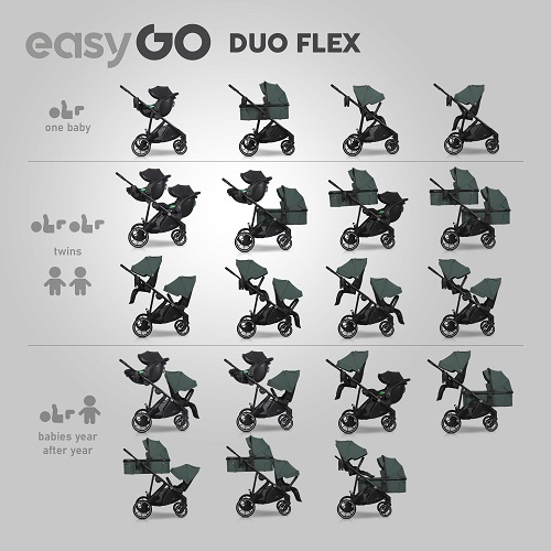 EasyGo Duoflex je kombinovaný súrodenecký kočík pre jedno alebo dve deti podobného veku, alebo pre dvojičky. Nástavby sú na kočíku umiestnené za sebou. Vďaka úzkej konštrukcii prejde aj bežnými dverami a ponúkne maximálnu variabilitu zostavenia.