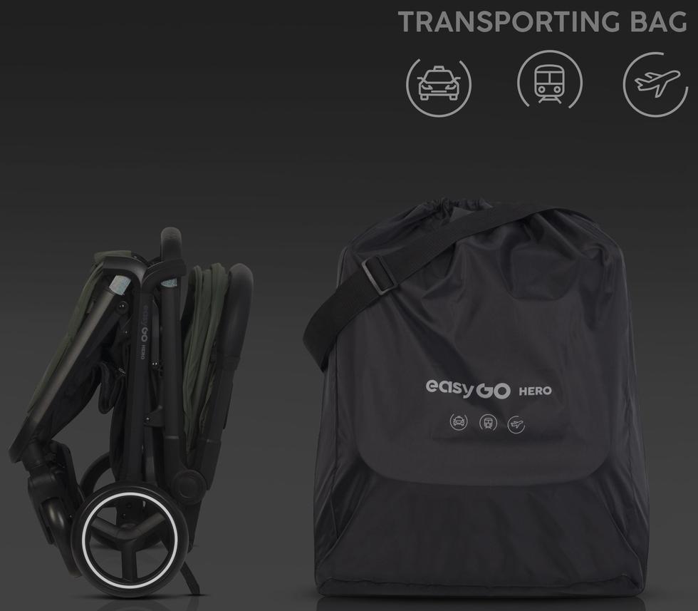 EasyGo Hero je ľahký pokračovací kočík s funkciou samoskladania, kompaktnými rozmermi a madlom na prenášanie. Vďaka zvýšenej pozícii striešky je vhodný aj pre väčšie dieťa. Ocenia ho rodičia, ktorí často cestujú alebo sa pohybujú po mestských povrchoch. Priestranné športové sedadlo je možné napolohovať až do úplného ľahu.