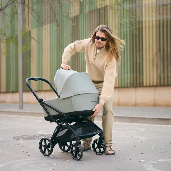 - Základnou súčasťou kočíka sú transportná taška a pláštenka.