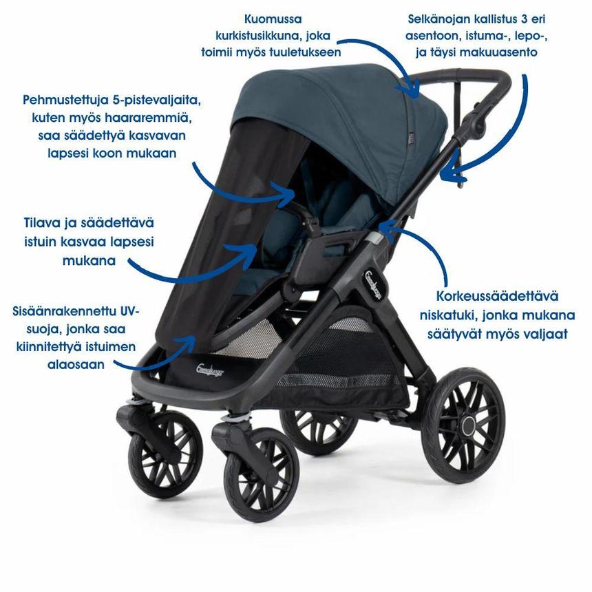 - predĺžiteľná nepremokavá strieška s UV 50+ a integrovanou slnečnou clonou ochráni dieťa pred slnkom aj nepriaznivým počasím,