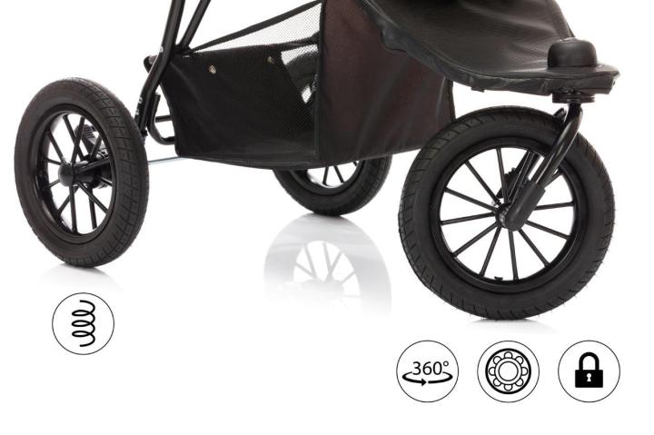 nafukovacie kolesá (fixné) • vhodný pre vysokých rodičov • takmer úplný rovný ľah (165°) • veľký úložný priestor • zadné kolesá ⌀30 cm • hmotnosť kočíka 12.3 kg • nosnosť sedačky 15 kg • šírka kočíka 66 cm