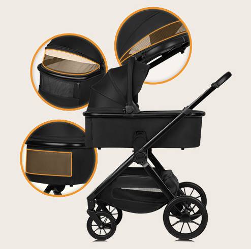 - V bohatej základnej výbave sú moskytiéra, pláštenka, taška, nánožník, držiak na nápoje, adaptéry na hlbokú vaničku, či adaptéry na nasadenie autosedačky.