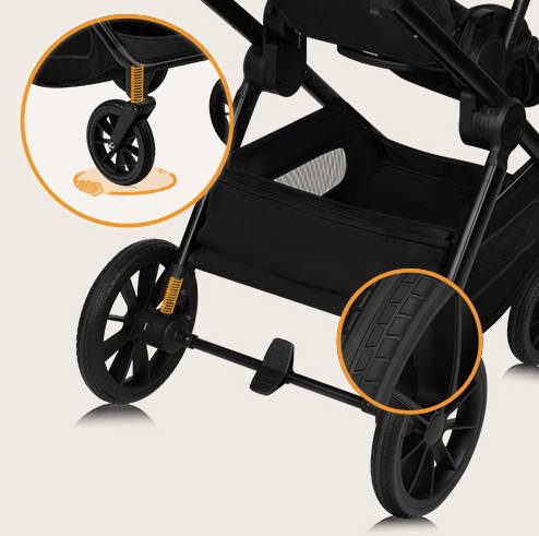 nafukovacie kolesá (otočné s možnosťou fixácie) • vhodný pre vysokých rodičov • úplný rovný ľah (180°) • otočné sedadlo • veľká vanička • priestranné sedadlo • velmi skladný • veľký úložný priestor • skladanie jednou rukou • možnosť pripojenia autosedačky • zadné kolesá ⌀29 cm • hmotnosť kočíka 13.5 kg • nosnosť sedačky 22 kg • šírka kočíka 56.5 cm