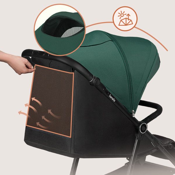 - predĺžiteľná vodeodolná XXL strieška s UV 50+ ochranou a vetracím uzatvárateľným náhľadovým okienkom ochráni pred akýmkoľvek počasím,
