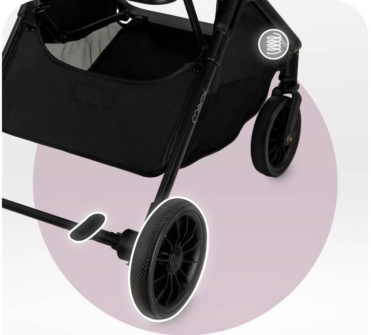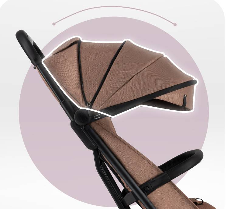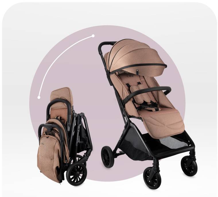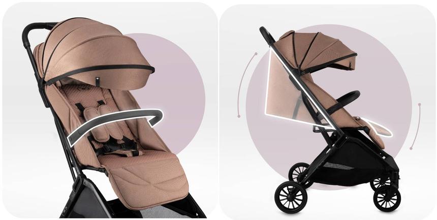 kolesá otočné s možnosťou fixácie • takmer úplný rovný ľah (165°) • veľká vanička • velmi ľahký • velmi skladný • veľký úložný priestor • skladanie jednou rukou • zadné kolesá ⌀17 cm • hmotnosť kočíka 7.6 kg • nosnosť sedačky 22 kg • šírka kočíka 50 cm
