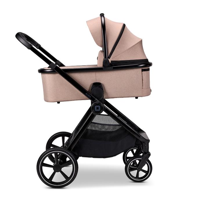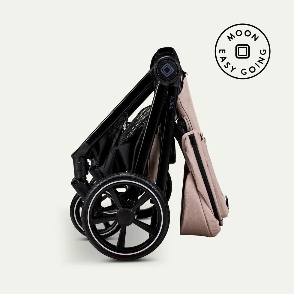 Moon Aura je kombinovaný kočík, ktorý vyniká predovšetkým svojimi výškovo nastaviteľnými adaptérmi pre hlbokú vaničku vo výbave, ktoré spolu s teleskopickou rukoväťou umožňujú prispôsobiť kočík podľa výšky rodiča. Oceníte aj priestranné otočné sedadlo polohovateľné do úplného ľahu, ktoré jednoducho zložíte do kompaktného rozmeru, bez toho aby ste museli zložiť sedadlo. Veľké gumové kolesá s odpružením všetkých kolies sú vhodné aj na dedinu.