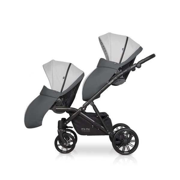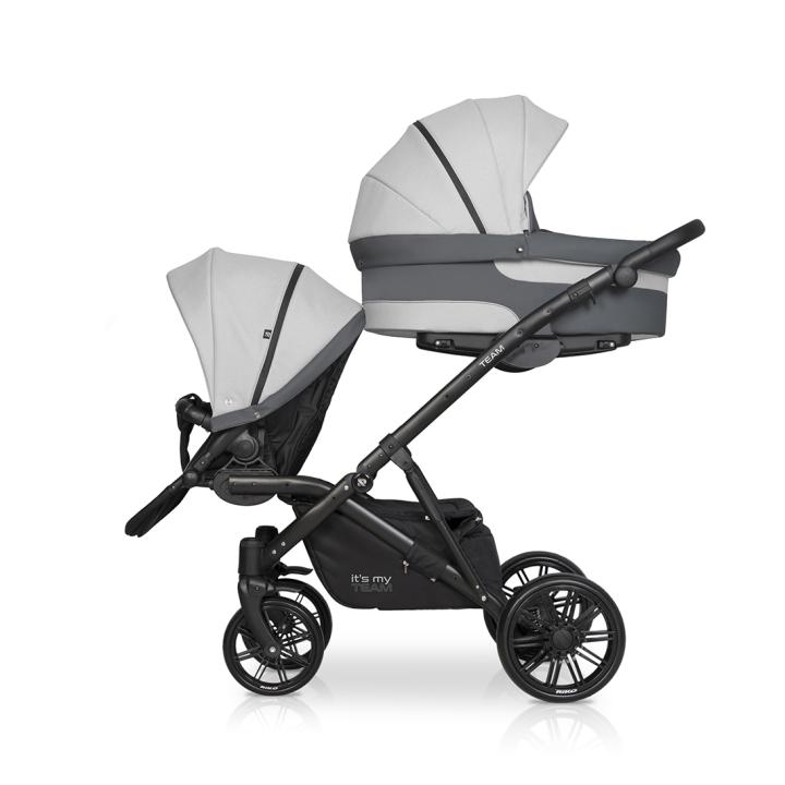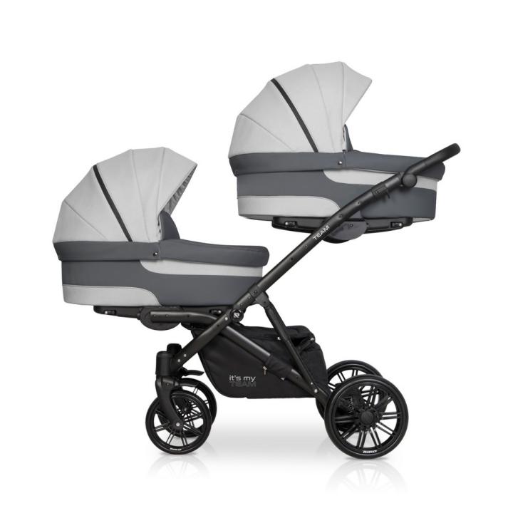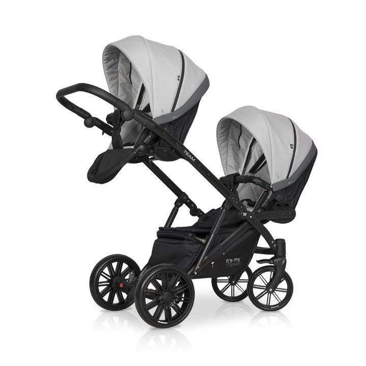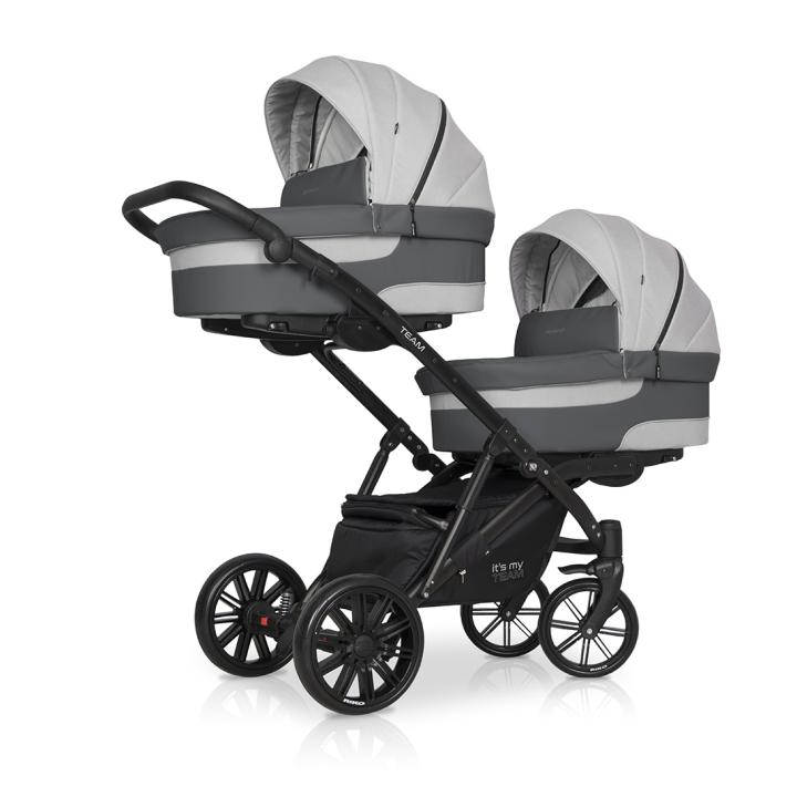 Riko Team (označovaný aj Teem) z roku 2018 je kombinovaný dvojkočík - tandem, ideálny pre dve vaničky a dve športové časti v sete pre dvojičky od narodenia. Jedná sa o robustný, ťažší kočík s väčšími kolesami a odpružením, preto je vhodnejší na dedinský či iný nerovný terén. Jeho pohodlnú jazdu aj cez nerovnosti oceníš i v meste - pokiaľ máš na neho dostatočne veľký kufor. Polohovateľné hlboké vaničky, do ľahu sklopné korýtkové sedacie časti či voliteľné autosedačky s adaptérmi na konštrukciu dokážeš nakliknúť v oboch smeroch. Sú naviac umiestnené jedna vyššie od druhej, aby obe deti mali dostatočný výhľad. Ku kombinácii patrí aj kompletá základná výbava v cene - pláštenky, moskytiéry, nánožníky a prebaľovacia taška.