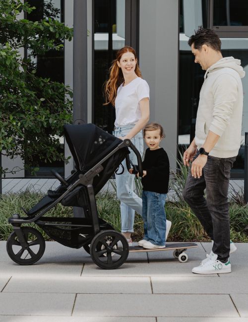 - kĺbová rukoväť z eko kože je výškovo nastaviteľná od 76 do 124 cm – vhodné pre rodičov rôznej výšky,