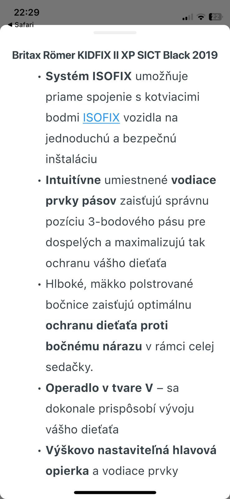 • oddelitelny podsedak, da sa pouzit aj zvlast • ISOFIT Soft Latch - ulahcuje upevnenie ku kotevným bodom ISOFIX vo vozidle • Sedadlo v tvare V rastie spolu s dietatom • vyskovo nastavitelna opierk...