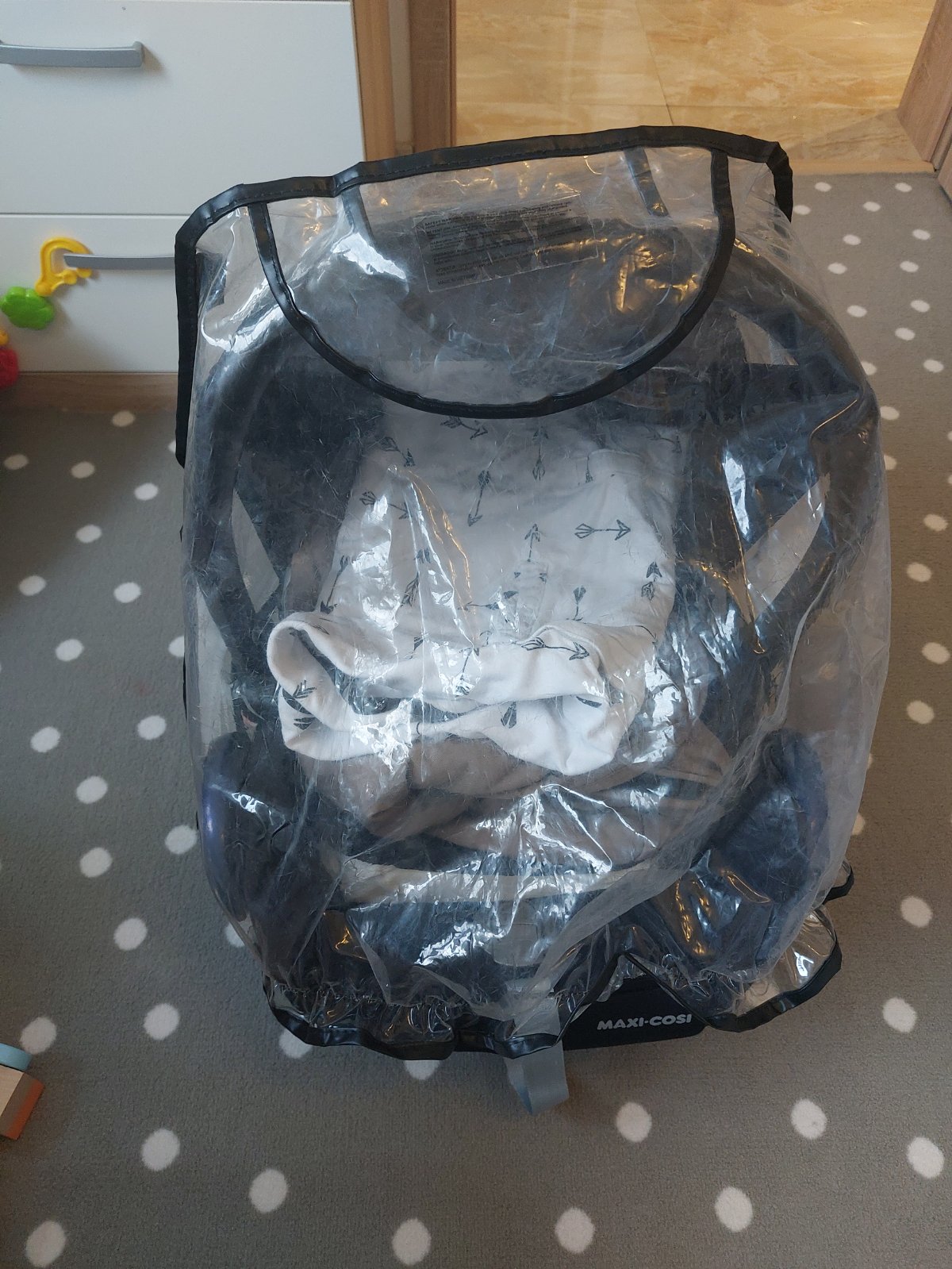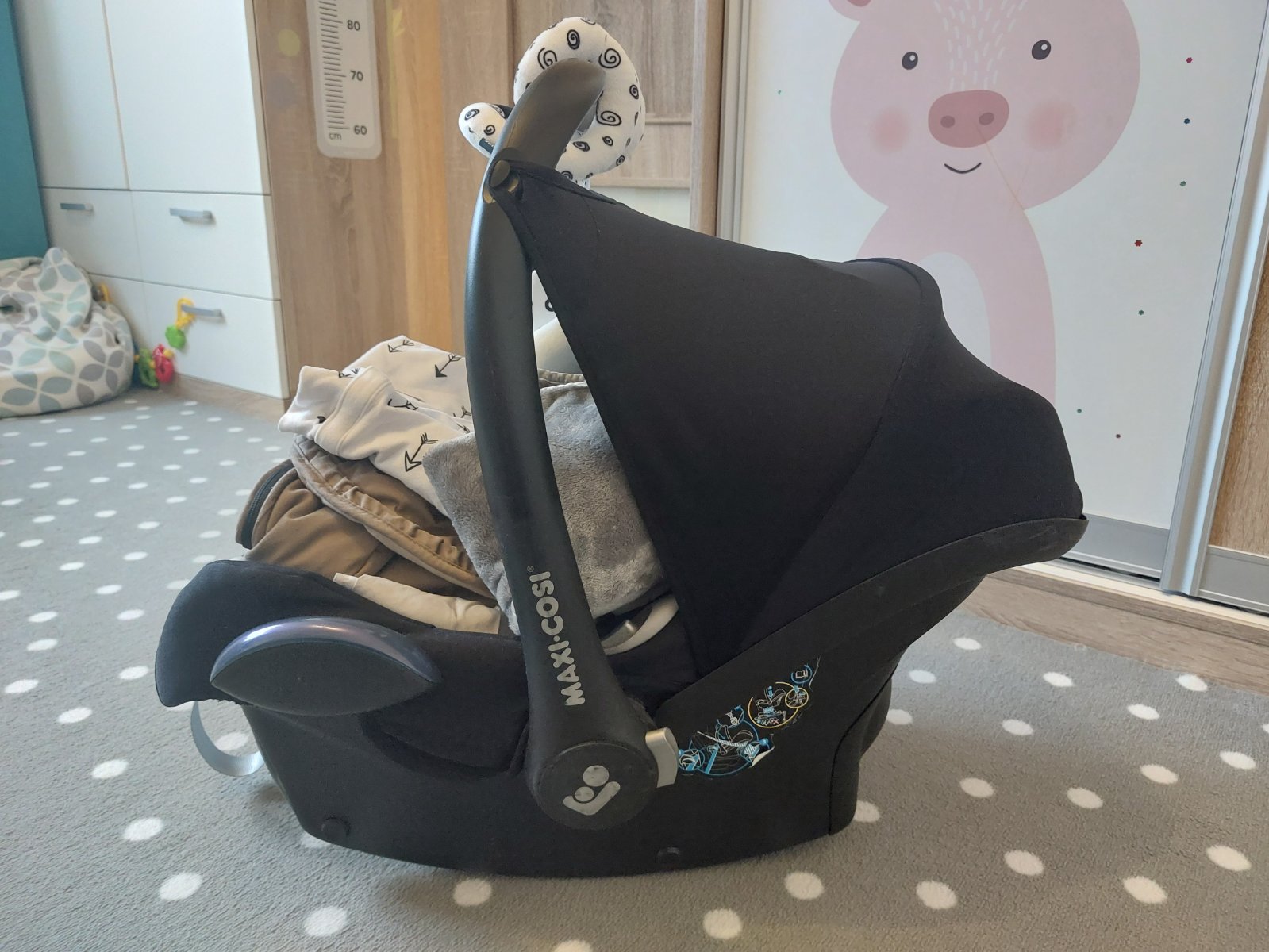 Vajíčko Maxi Cosi, plus k tomu dám fusak, deku, sieťku proti hmyzu, pršiplášť, hračku, knižky.