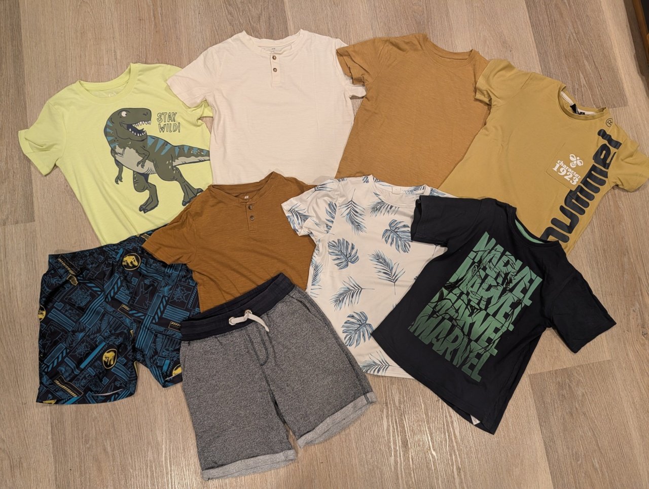 Predám balík oblečenia, veľ. 134/140. Balík obsahuje 7x tričko s krátkym rukávom + 2x šortky. Šortky s dinosaurami majú vnútri sieťku. Veci nie sú poškodené, sú bez škvŕn. Cena je za celý balík, bez poštovného.