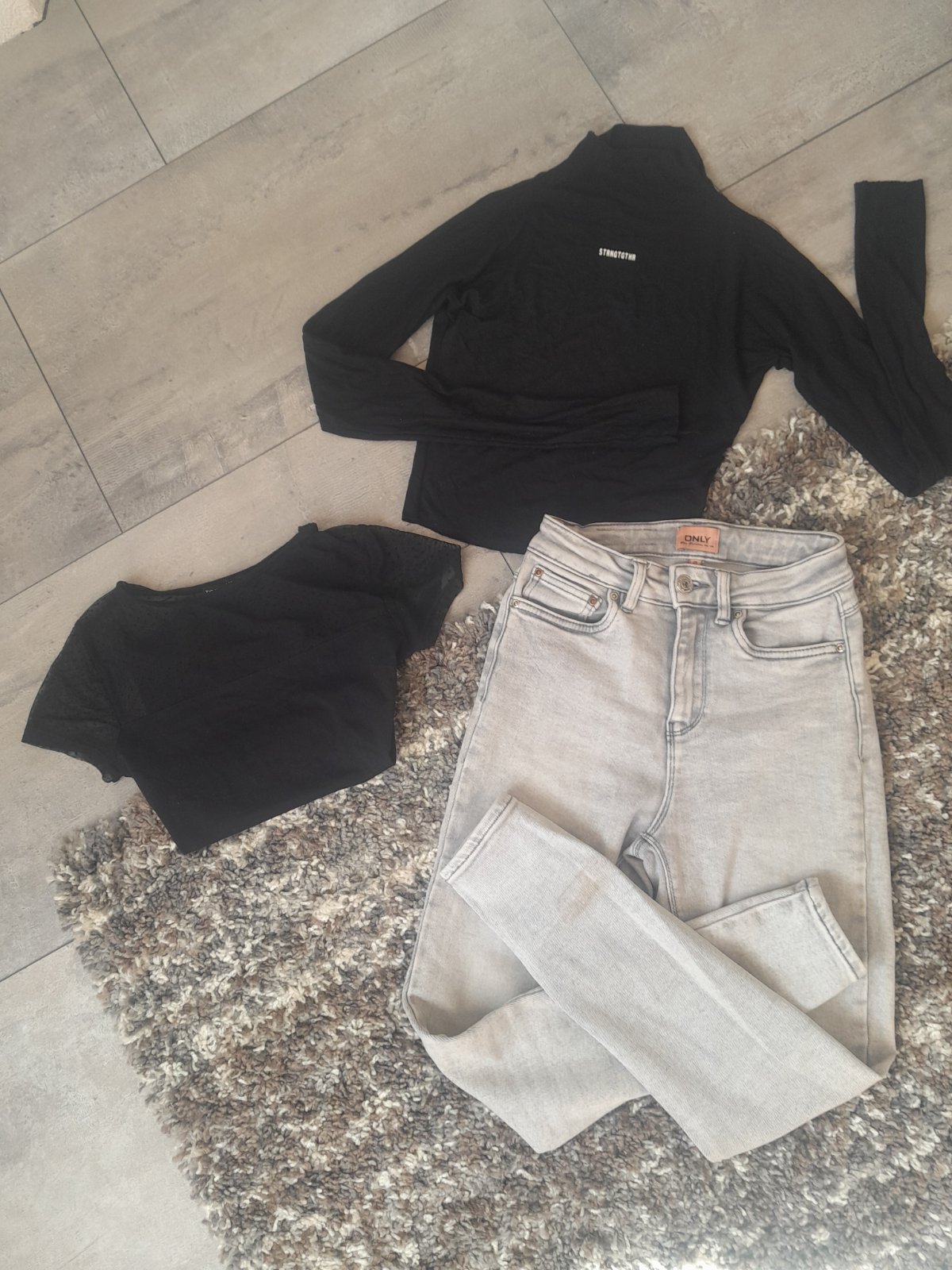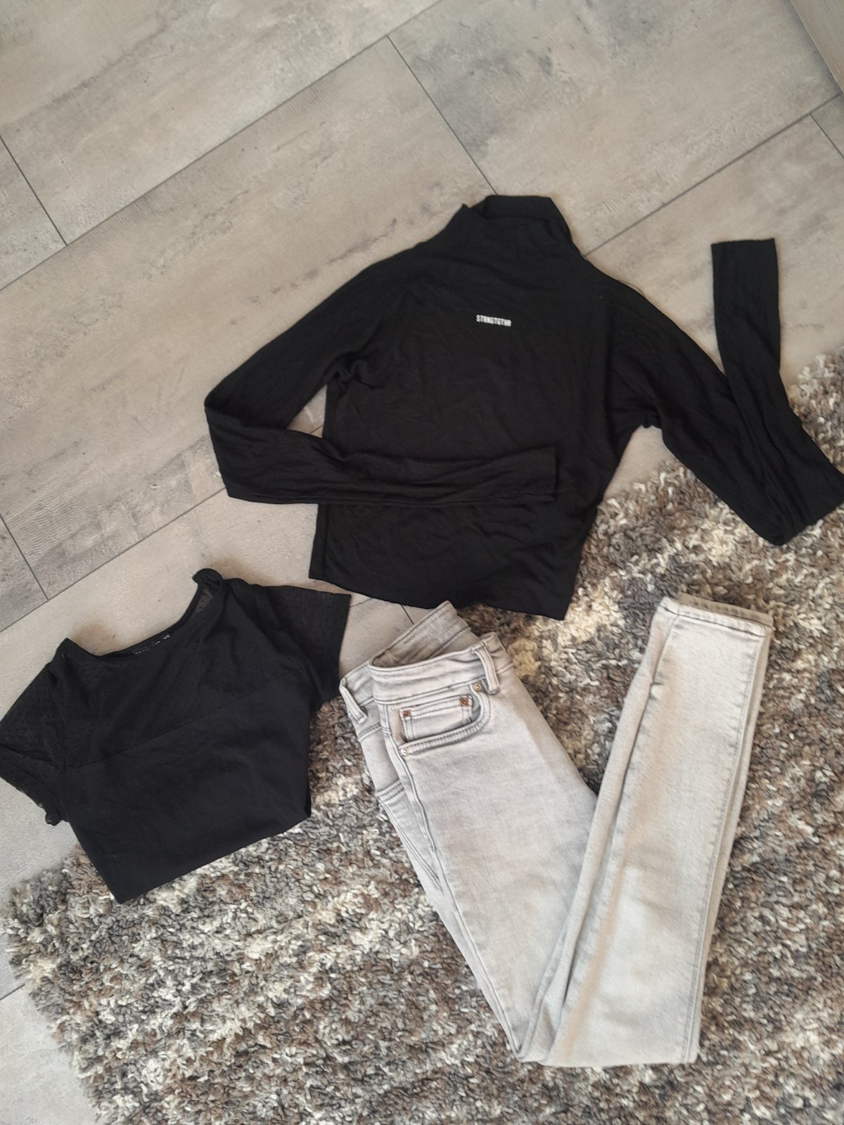 1x elastické rifle super sedia veľmi príjemný materiál, 1x topik xs a tričko s krajkou
