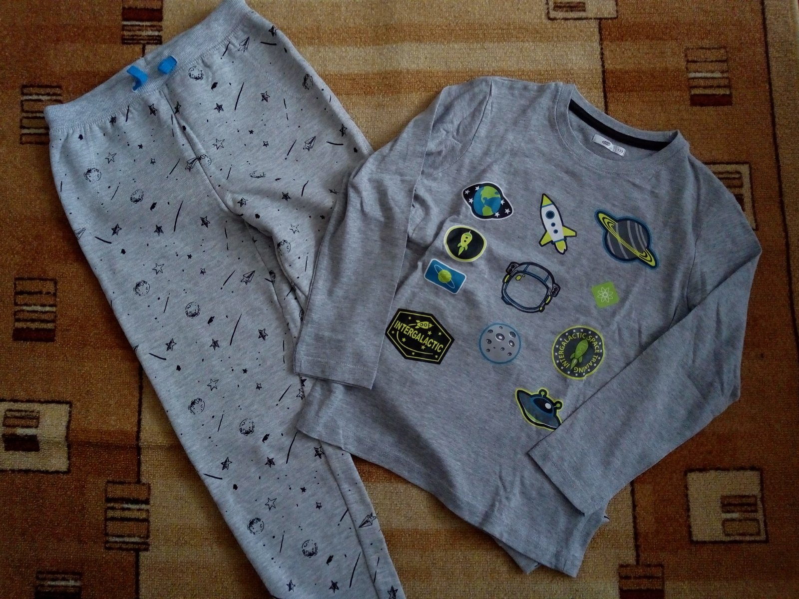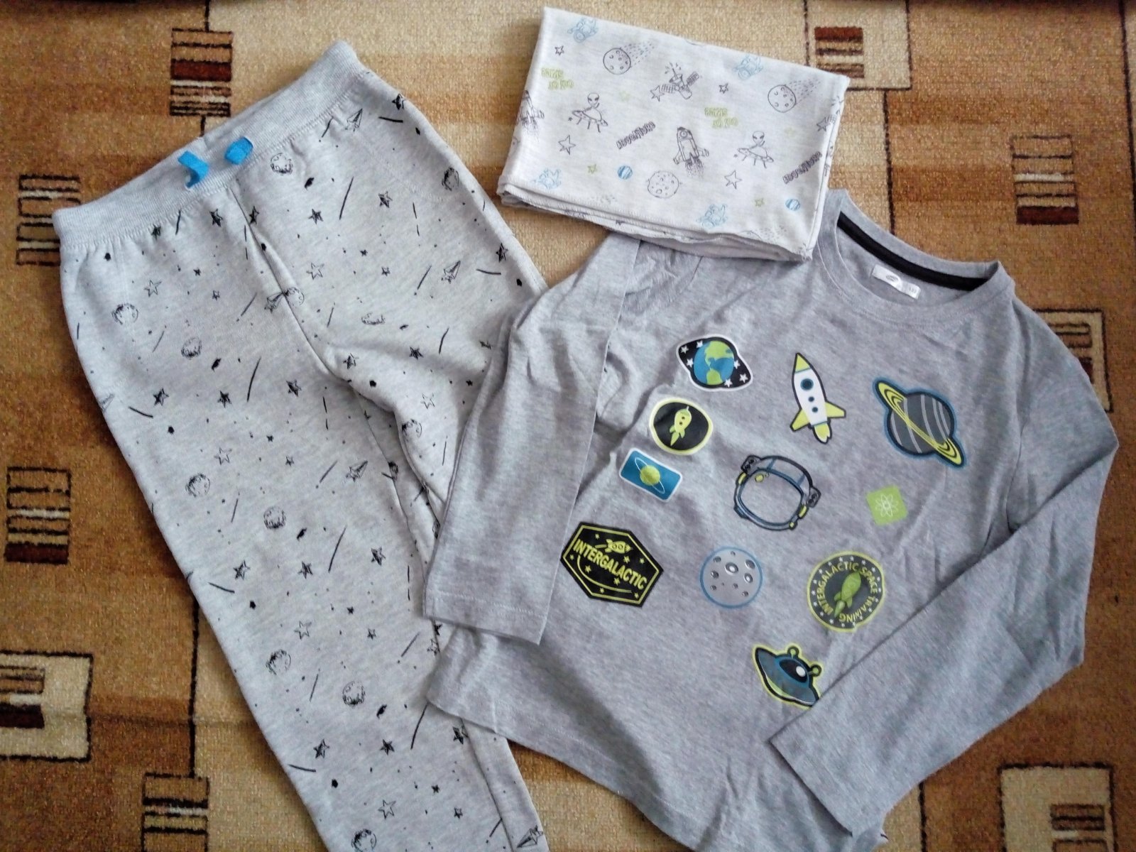 Pekné bavlnené,tepláky a nákrčník s vesmírnou tématikou.Top stav, aj ako darček.Len vyskúšané.Tričko predané má