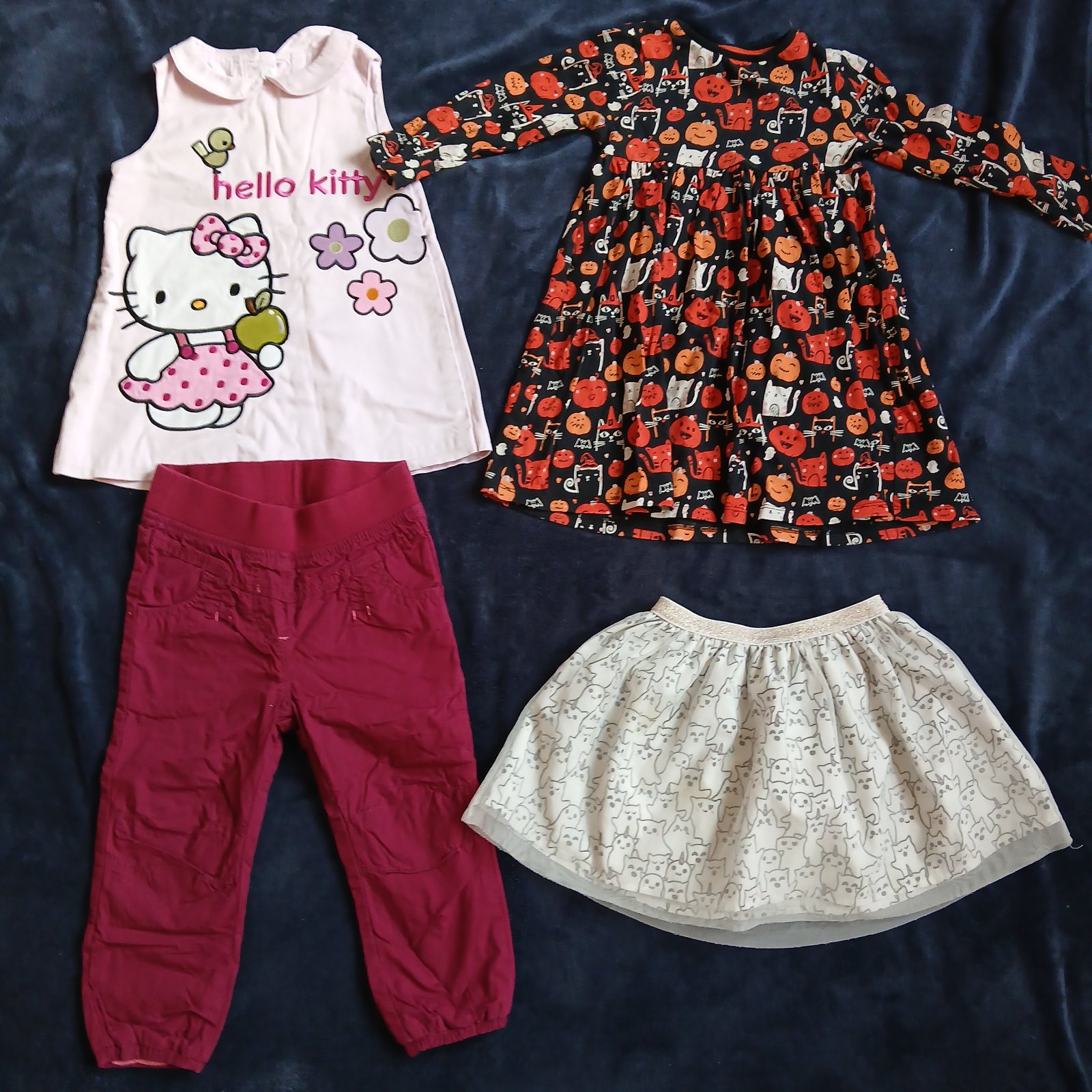 Predam oblečenie 92, teplákoch súprava, saty heslo kitty a mikina 86, oblecenie je bez flakov a poškodení.