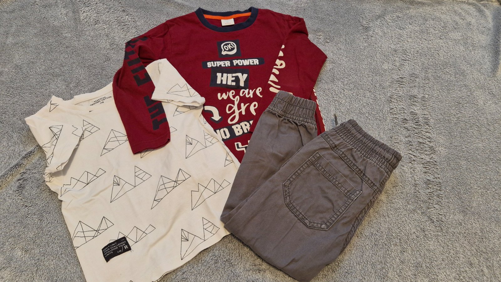 Všetko veľkosť 110, tričko s dlhým rukávom zn. BOBOLI, tričko s krátkym rukávom zn RESERVED, nohavice zn. F&f.