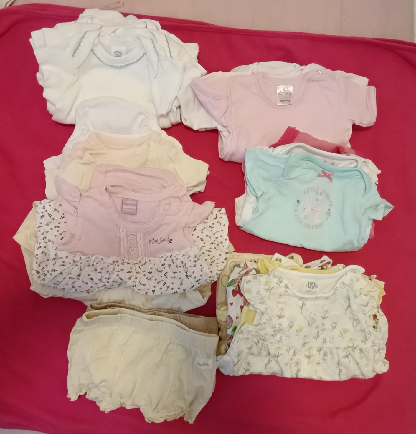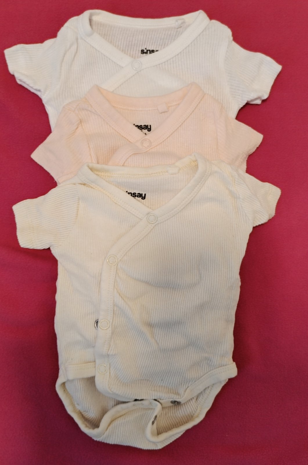 Mix oblečenia na 3-6 mesiacov - väčšina je 68, ale niektoré vecičky sú 62. Všetky sú nosený stav bez fľakov a bez dier, nosenie vidno na žmolkoch z prania a na žltých body popraskaná potlač - viď f...